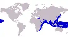 The Shrimp scad is present in the Indo-Pacific region from the Red Sea and east Africa to the Hawaiian Islands, north to Japan and south to Australia.[6][8][5] Observed in the Mediterranean Sea since it was recorded first off Palestine in 1927 as Caranx calla, it later extended to the Aegean Sea, Egypt, Libya and Tunisia.[9][10] It is also recorded in the Marmara Sea.[11] The species is primarily an inshore inhabitant of reefs and over open sand patches, even in moderately turbid waters,[12] often forming large schools. The species has in isolated circumstances also been found close to shore in surf zones in Japan[13] and in estuarine waters in South Africa.[14] The species is occasionally found in offshore environments, suggesting it can lead a pelagic lifestyle also.[15]