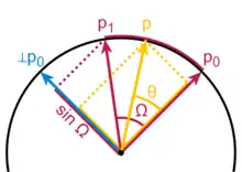 More familiar than the general Slerp formula is the case when the end vectors are perpendicular, in which case the formula is p0 cos θ + p1 sin θ. Letting θ = t π/2, and applying the trigonometric identity cos θ = sin (π/2 − θ), this becomes the Slerp formula. The factor of 1/sin Ω in the general formula is a normalization, since a vector p1 at an angle of Ω to p0 projects onto the perpendicular ⊥p0 with a length of only sin Ω.