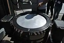 The telescope's imaging camera is made up of 30 CCD chips, each with a resolution of 2048 × 2048 pixels, totaling approximately 120 megapixels.[11] The chips are arranged in 5 rows of 6 chips. Each row has a different optical filter with average wavelengths of 355.1 (u), 468.6 (g), 616.5 (r), 748.1 (i), and 893.1 (z) nm, with 95% completeness in typical seeing to magnitudes of 22.0, 22.2, 22.2, 21.3, and 20.5, for u, g, r, i, z respectively.[12] The filters are placed on the camera in the order r, i, u, z, g. To reduce noise, the camera is cooled to 190 kelvins (about −80 °C) by liquid nitrogen.