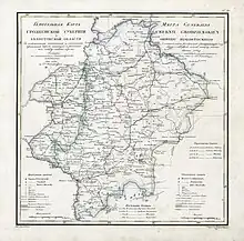 The Grodno Governorate[lower-alpha 1] was a governorate (guberniya) of the Northwestern Krai of the Russian Empire, with its administrative center in Grodno (Hrodna). The governorate encompassed 38,671.5 square kilometres (14,931.1 sq mi) in area and consisted of a population of 1,631,645 inhabitants by 1897. The Grodno Governorate bordered by the Suwałki Governorate to the north, the Vilna Governorate to the northeast, the Minsk Governorate to the east, the Volhynian Governorate to the south, the Kholm Governorate to the west, and the Łomża Governorate to the northwest. The governorate covered areas of the modern Grodno Region of Belarus, part of the Podlaskie Voivodeship of Poland, and a small part of Druskininkai, Lazdijai and Varėna districts.