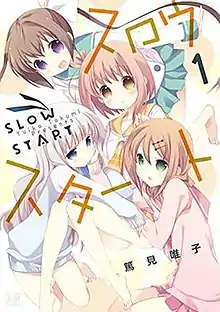 Slow Start (スロウスタート, Surou Sutāto) is a Japanese four-panel manga series by Yuiko Tokumi, serialized in Houbunsha's seinen manga magazine Manga Time Kirara since 2013. It has been collected into ten tankōbon volumes. A 12-episode anime television series adaptation by CloverWorks aired between January 7 and March 25, 2018.[lower-alpha 1][2][3]