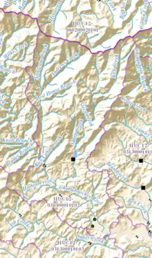 The creek watershed is designated by the United States Geological Survey as sub-watershed HUC 031300010102, is named Smith Creek-Chattahoochee River sub-watershed, and drains an area of approximately 27 square miles north of Helen, and east of the Chattahoochee River. In addition to Smith Creek, the area is drained by Spoilcane Creek to the west of Smith Creek, which is 5.67 miles (9.12 km) long,[1] and Horton Creek to its south, which is 2.66 miles (4.28 km) long,[1] both of which flow into Smith Creek on its way to the Chattahoochee.[4]