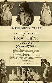 Snow White is a 1916 American silent romantic fantasy film directed by J. Searle Dawley. Winthrop Ames adapted it from his own 1912 Broadway play Snow White and the Seven Dwarfs, which was in turn adapted from the 1812 fairy tale (as collected by the Brothers Grimm). The film stars Marguerite Clark and Creighton Hale, Clark reprising her stage role.[1]