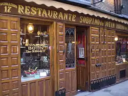 Sobrino de Botín is a Spanish restaurant in Madrid,[1] and the oldest restaurant in the world in continuous operation.[2] The artist Francisco de Goya worked in Café Botín as a waiter while waiting to get accepted into the Royal Academy of Fine Arts. The restaurant is mentioned in an Ernest Hemingway novel and the book Fortunata y Jacinta by Benito Pérez Galdós (published 1886–1887).