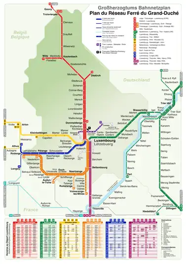 - Ligne 6 Luxembourg – Bettembourg-Frontière, 6a Bettembourg – Esch/Alzette, 6b Bettembourg – Dudelange-Usines (Volmerange), 6c Noertzange – Rumelange, 6d Tétange – Langengrund, 6e Esch-sur-Alzette – Audun-le-Tiche, 6f Esch-sur-Alzette – Pétange, 6g Pétange – Rodange-Frontière (Aubange), 6h Pétange – Rodange-Frontière (Mont St. Martin), 6j Pétange – Rodange-Frontière (Athus), 6k Brucherberg – Scheuerbusch