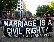 Socialist Alternative's highest-profile public representative is Seattle City Councillor Kshama Sawant, who was elected in November 2013.[3] It is active in over 50 cities in the United States,[4] and campaigns for socialist issues. In September 2013, it began publishing a monthly newspaper, Socialist Alternative,[5] along with various local newsletters and media outlets, including a radio show in the Boston area. It is a member of International Socialist Alternative, an international organization of Trotskyist parties.