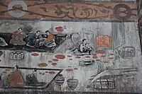 Certain occupations were traditionally reserved for women, while they were also exempted from corvée labor duties.[167] Women were expected to rear children, weave clothes for the family, and perform domestic duties such as cooking; although farming was considered men's work, sometimes women tilled fields alongside their husbands and brothers.[168] Some women formed communal spinning and weaving groups to pool resources together to pay for candles, lamp oil, and heat during night and winter.[169] A successful textile business could employ hundreds of women.[73] Singing and dancing to entertain wealthy patrons were other common professions open for women.[170] When a husband died, sometimes the widow became the sole supporter of her children, and thus had to make a living weaving silk cloths or making straw sandals to sell in the market.[171] Some women also turned to the humble profession of sorcery for income.[172] Other more fortunate women could become renowned medical physicians who provided services to the families of high officials and nobility.[173] Some wealthy women engaged in luxury trade, such as one who frequently sold pearls to a princess.[174] Some even aided in their husband's business decisions.[175] Female merchants dressed in silk clothes which rivaled even female nobles' attire were considered immoral compared to the ideal woman weaver.[175]