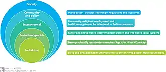 Socioecology is the scientific study of how social structure and organization are influenced by an organism's environment. Socioecology is primarily related to anthropology, geography, sociology, and ecology. Specifically, the term is used in human ecology, the study of the interaction between humans and their environment. Socioecological models of human health examine the interaction of many factors, ranging from narrowest (individual behaviors) to broadest (federal policies). The factors of socioecological models consist of individual behaviors, sociodemographic factors (race, education, socioeconomic status), interpersonal factors (romantic, family, and coworker relationships), community factors (physical and social environment), and societal factors (local, state, and federal policies.[1]