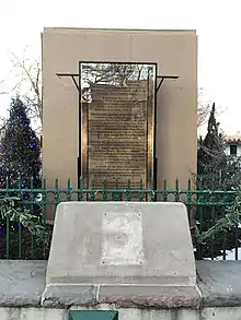 The monument consists of a stone obelisk with four engraved marble panels on the stone base commemorating U.S. soldiers who died in battles in New Mexico. It is located in the central area of the Santa Fe Plaza in downtown Santa Fe.[9] The monument has a stone foundation; a locally produced brick and lime core plinth; local stone inscribed panels; imported Italian marble trim with marble columns and marble wreathes (Victorian funerary motifs), and marble obelisk. The cenotaph, with its Egyptian architectural associations, is 33-feet tall.[7][10] Builders were McGee & Brother (John and Michael McGee), architects, master stone cutter Tomas Baca, and local craftsmen.[11] The stone panels were inscribed by local craftsmen.[12]
