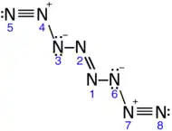 The decomposition of hydrazinium azide at high pressure and low temperature produces a molecular solid made of linear chains of 8 nitrogen atoms (N≡N+−N−−N=N−N−−N+≡N). Simulations suggest that N8 is stable at low temperatures and pressures (< 20 GPa); in practice, the reported N8 decomposes to the ε allotrope below 25 GPa but a residue remains at pressure as low as 3 GPa.[35][36]
