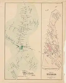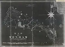 - 1795: Surveyed by Richard Dodge, this is the oldest map known of Wenham, and shows the town’s boundaries, roads and major bodies of water. Current-day Maple Street appears, as does that portion of current-day Topsfield Road northwest of Maple Street. (Note that current-day Topsfield Road did not extend to the Beverly town line, but stopped at current-day Maple and Cherry Streets.)