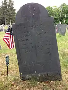 to quell the Tory insurrections, or mobs, that existed … where the old loyal Scotch element so largely predominated. … His greatest troubles were in New Boston, where the Tories had their rendezvous. But it appears that here he found friends, and soon after the war he moved his family from Wenham, Mass., to New Boston, and settled on a tract of land in the south part of the town, where he resided until his death, in 1814 [sic], which was occasioned by the falling of a tree.[67]