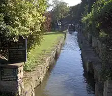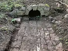 The two images show a spillway drain from c. 1796 (uncovered in 2009–10) at Upper Midford, a location where a caisson to take the canal from the 180 ft (55 m) level to the 134 ft (41 m) level at Midford Aqueduct was proposed.