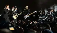 U2 embarked on the Innocence + Experience Tour in May 2015,[17] visiting arenas in North America and Europe from May through December.[18] The band originally began the tour with the intent to stage it in two phases, one with material primarily taken from Songs of Innocence and one with material that would eventually be from Songs of Experience.[19] The group structured their concerts around a loose autobiographical narrative of "innocence" passing into "experience", with a fixed set of songs for the first half of each show and a varying second half, separated by an intermission—a first for U2 concerts.[20] The stage spanned the length of the venue floor and comprised three sections: a rectangular main stage, a smaller circular B-stage, and a connecting walkway.[20] The centerpiece of the set was a 96-foot-long (29 m) double-sided video screen that featured an interior catwalk, allowing the band members to perform amidst the video projections.[21][22] U2's sound system was moved to the venue ceilings and arranged in an oval array, in hopes of improving acoustics by evenly distributing sound throughout the arena.[20] In total, the tour grossed US$152.2 million from 1.29 million tickets sold.[23]