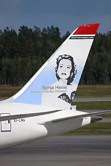 - For a time, Sonja Henie's picture adorned the tail of a Boeing 737-300 of the airline Norwegian Air Shuttle. As the Boeing 737-300 was being phased out, her picture was placed on the tail of a Boeing 737-800 of the same airline and in 2013 to the tail of Norwegian Air Shuttle's first Boeing 787 Dreamliner.[23] One of the airline's trademarks is having portraits of famous deceased Norwegians on the tails of its aircraft.[24]