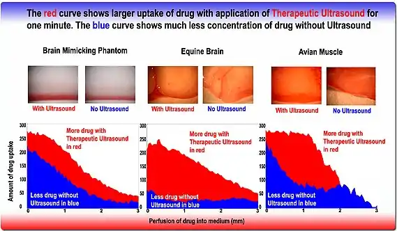 In vivo ultrasound mediated drug delivery was first reported in 1991[15] and many other preclinical studies involving sonoporation have followed. This method is being used to deliver therapeutic drugs or genes to treat a variety of diseases including: Stroke, Cancer, Parkinson's, Alzheimer's...[13] The preclinical utility of sonoporation is well illustrated through past tumor radiation treatments which have reported a more than 10-fold cellular destruction when ionizing radiation is coupled with ultrasound-mediated microbubble vascular disruption. This increase in delivery efficiency could allow for the appropriate reduction in therapeutic dosing.[16]