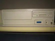 Both 680x0 and MIPS models share the same case, which has a large door covering a floppy drive and a 5.25-in expansion bay, which can house a SCSI tape or CD-ROM drive. The details of the door are slightly different: two windows for the 680x0 models, while the MIPS ones have a single large window. Also hidden by the cover are a reset button and a series of DIP switches used to configure some bootup parameters.