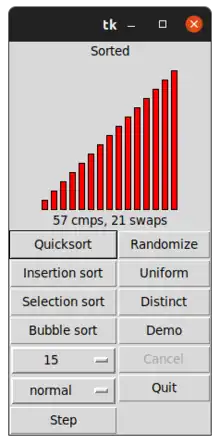 | Cocktail shaker sort | n | 1 | Yes | Exchanging | A variant of Bubblesort which deals well with small values at end of list | ||