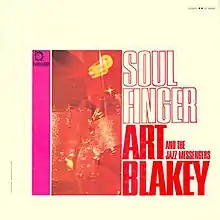 Soul Finger is an album by drummer Art Blakey recorded in 1965 and originally released on the Limelight label.[2][3] On the 2009 CD edition, Gary Bartz, whose recording debut this was, was left off the credits - he is the saxophonist (alto) for five of the six cuts. Lucky Thompson is on only one cut, playing soprano sax on "Spot Session" with the quartet of Blakey, Hicks and Sproles. A sixth cut from the Bartz sessions was used on the later Hold On, I'm Coming album. This was trumpeter Lee Morgan's last recording with Art Blakey after a seven-year association; Freddie Hubbard would return to tour with Blakey's group again in the 1980s.