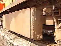 To be usable on the iron ore line, Class 34-900 locomotives which ended up working there were modified to a similar fuel capacity. The inter-bogie linkage was removed and the fuel tank was enlarged by changing it from saddle-shaped to rectangular box-shaped. To maintain its lateral balance, a slab of metal was attached to each bogie in place of the removed linkage. In the second picture, the weld lines on the end of the enlarged fuel tank as well as the metal slab at the end of the bogie are visible.[7]