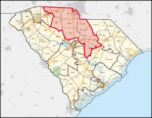 From 2003 to 2013 the district included all of Cherokee, Chester, Chesterfield, Darlington, Dillon, Fairfield, Kershaw, Lancaster, Marlboro, Newberry and York counties and parts of Florence, Lee and Sumter counties.