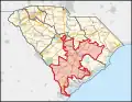 South Carolina's 6th congressional district is in central and eastern South Carolina. It includes all of Allendale, Bamberg, Calhoun, Clarendon, Hampton, and Williamsburg counties and parts of Charleston, Colleton, Dorchester, Florence, Jasper, Orangeburg, Richland and Sumter counties. With a Cook Partisan Voting Index rating of D+14, it is the only Democratic district in South Carolina.[2]