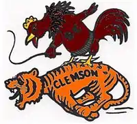 USC won its first game in its third season, on November 2, 1895, against Columbia AA.[3] The squad designated their first head coach, W. H. "Dixie" Whaley, the following year.[3] The 1896 season also saw the inaugural game against arch-rival Clemson on November 12, which Carolina won 12–6.[3] From 1902 to 1903, coach Bob Williams led the Gamecocks to a 14–3 record.[5] In 1902, South Carolina beat Clemson, coached by John Heisman, for the first time since 1896, the first year of the rivalry.[6] "The Carolina fans that week were carrying around a poster with the image of a tiger with a gamecock standing on top of it, holding the tiger's tail as if he was steering the tiger by the tail", Jay McCormick said. "Naturally, the Clemson guys didn't take too kindly to that, and on Wednesday and again on Thursday, there were sporadic fistfights involving brass knuckles and other objects and so forth, some of which resulted, according to the newspapers, in blood being spilled and persons having to seek medical assistance. After the game on Thursday, the Clemson guys frankly told the Carolina students that if you bring this poster, which is insulting to us, to the big parade on Friday, you're going to be in trouble. And naturally, of course, the Carolina students brought the poster to the parade. If you give someone an ultimatum and they're your rival, they're going to do exactly what you told them not to do."[7]