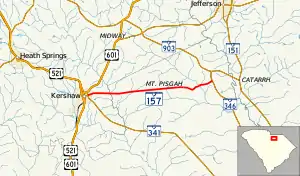 South Carolina Highway 157 (SC 157) is a 10.210-mile-long (16.431 km) state highway in the Sandhills region of the U.S. state of South Carolina. Though it physically travels west to east, it is signed as a north–south highway. Its southern terminus (eastern end) is at SC 346 about two miles (3.2 km) west of Catarrh. Its northern terminus (western end) is at SC 341 in Kershaw. This is also the southern terminus of SC 157 Truck and SC 341 Truck.
