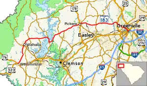 SC 183 begins at an intersection with U.S. Route 76 (US 76) and US 123 in Westminster. It travels north to Walhalla and then east to meet SC 130 for a short concurrency on Rochester Highway near the Oconee Nuclear Station at Lake Keowee in Seneca in Oconee County.[4][5] The road, known as East Pickens Highway, moves east by northeast over a tributary that feeds into Lake Hartwell where the road name changes to Walhalla Highway as the highway enters Pickens County, 1.22 mi (1.96 km) eastward.[6] Upon entering Pickens County, the highway travels 4.3 mi (6.9 km) north by northeast before intersecting at SC 133.[6] SC 183 moves 2.1 mi (3.4 km) where it intersects Six Mile Road, the northern terminus of SC 137.[6] Traveling east by northeast on Walhalla Highway, SC 183 goes 5.8 mi (9.3 km) before reaching downtown Pickens, the county seat. SC 183 travels concurrently with US 178 through downtown Pickens on Main street for 0.02 mi (0.032 km) on East Main Street.[6] The highway travels 0.19 mi (0.31 km) where it intersects SC 8.[6] Traveling concurrently with SC 8 for 0.44 mi (0.71 km) northeastward on Jewel Road, SC 183 splits off from SC 8 to become Farrs Bridge Road.[6] SC 183 moves 5.64 mi (9.08 km) where it intersects SC 135 at Dacusville Road.[6] It then moves eastward 8.32 mi (13.39 km) where it intersects US 25 in Greenville County, crossing over the Saluda River in the process.[6][7] Traveling southeastward for 0.91 mi (1.46 km), SC 183 enters Berea.[7] Once SC 183 passes West Parker Road, the road names changes to Cedar Lane Road, then travels an additional 1.70 mi (2.74 km) to reach West Blue Ridge Drive at SC 253.[7] SC 183 travels an additional 1.79 mi (2.88 km) southeast, becoming Pete Hollis Boulevard, and intersecting Stone Avenue and Rutherford Street.[7] It has a second intersection with US 123 at North Academy Street in downtown Greenville a further 0.41 mi (0.66 km) southeast.[8][7][9] Then, it continues to the southeast and reaches its eastern terminus, an intersection with US 29 (Church Street).
