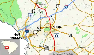 South Carolina Highway 19 (SC 19) is a 28.750-mile (46.269 km) primary state highway in the U.S. state of South Carolina. It connects Aiken directly with the Savannah River Site and Edgefield via U.S. Route 25 (US 25).