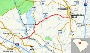 SC 213 begins at an intersection with U.S. Route 176 (US 176) southeast of Pomaria within Newberry County, where the roadway continues as Parr Road. It travels to the east and crosses over Crims Creek. A short distance later, the highway crosses over the Broad River, Hampton Island and some railroad tracks on an unnamed bridge. This bridge marks the Fairfield County line. SC 213 travels to the northeast and intersects SC 215 (Monticello Road) near Jenkinsville. The two highways travel concurrently along the southeastern edge of the Monticello Reservoir. They split, with SC 213 traveling to the east. A short distance later, it curves to the northeast and then crosses over Little River. Farther to the northeast is a crossing of Robinson Branch. It skirts along the southwestern edge of the city limits of Winnsboro. After a short rural section, it meets its eastern terminus, an intersection with US 321/SC 34 just southwest of Winnsboro Mills. This intersection also marks the southern terminus of US 321 Business (Columbia Road).[3]