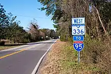 SC 336 is a two-lane rural highway predominantly throughout its route. Starting at US 321 in Tillman, it goes east into downtown Ridgeland, then continuing east to SC 462 in Old House where it ends. Its routing east of Interstate 95 (I-95) takes a series of turns, making the highway's routing a bit disjointing.[2] Travelers wishing to bypass Ridgeland can continue straight on Smiths Crossing (S-27-29), saving a 0.5 miles (0.80 km) and a few minutes, though large trucks are restricted from using that route.