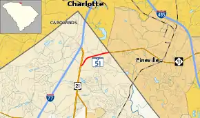The York County segment of SC 51 is a short one-mile (1.6 km) road that starts at US 21 near Fort Mill and ends at the North Carolina state line, where it continues on as NC 51 through Pineville. The route is entirely two-lane, expanding to four lanes at the state line.[6][7]