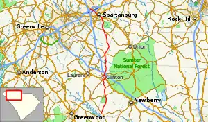 | Clinton | 18.870 | 30.368 | Southern end of SC 72 concurrency; southern terminus of SC 56 Bus. | |||||