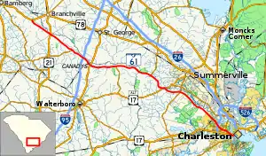 South Carolina Highway 61 (SC 61) is a 67-mile-long (108 km) state highway in the U.S. state of South Carolina. The highway is designated on a north–south direction, but physically travels in an east–west direction, from SC 30 in Charleston to U.S. Route 78 (US 78) near Branchville. The portion of SC 61 from Church Creek Bridge and 10 miles (16 km) north is designated a National Scenic Byway.[2]
