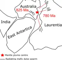 - The magmatism was due to the Rodinia giant mantle plume. Previous study advocated for a so-called "SWEAT" configuration (i.e. Southwest Laurentia–East Antarctic) in the Rodinia supercontinent.[30] However, the age and geographical position of giant plume-related radiating dyke swarm argue against this model.[31] First, the age difference is too large to be considered as the same dyke swarm. Second, the dyke swarm in Laurentia suggest a mantle plume centre to its west but there is no such evidence in eastern Australia.
