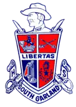 South Garland High School (SGHS) is a secondary school located in Garland, Texas. The school is part of the Garland Independent School District. The mascot for SGHS is the Titan, after retiring the Colonel, and the school colors are red and Columbia blue. The top right “square” on their shield used to be the confederate flag later being replaced by the swords. In 2009, the school was rated "academically acceptable" by the Texas Education Agency.[3]