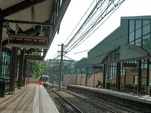 South Hills Junction station is a station on Pittsburgh Regional Transit's light rail network.[2] This station served as the original "merge point" of the inbound Beechview and Overbrook branches of the light rail system, just before the run under Mount Washington through the Mount Washington Transit Tunnel and into downtown Pittsburgh. In 1993 the Overbrook (Blue) Line was shut down for complete reconstruction to serve the modern-day light rail cars.[3] During construction, it was found that a segment of track between the Boggs Ave. stop and South Hills Junction was too narrow for the larger vehicles; this was bypassed with two wide-curved rail ramps built between the Beechview (Red) Line's Palm Garden stop and South Hills Junction where the two branches now merge.