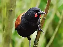 The South Island saddleback was formally described in 1789 by the German naturalist Johann Friedrich Gmelin in his revised and expanded edition of Carl Linnaeus's Systema Naturae. He placed it with the starlings in the genus Sturnus and coined the binomial name Sturnus carunculatus.[2] The specific epithet carunculatus is Latin for a small piece of flesh, hence wattles.[3] Gmelin based his description on the "wattled stare" that had been described and illustrated in 1783 by the English ornithologist John Latham in his book A General Synopsis of Birds. Latham has examined a specimen in the collection of the Leverian Museum in London that had come from New Zealand.[4] The word "stare" is an archaic word for a starling.[5] The South Island saddleback is now placed with the North Island saddleback in the genus Philesturnus that was introduced in 1832 by the French zoologist Isidore Geoffroy Saint-Hilaire .[6]
