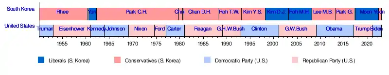 In terms of American leadership, Bill Clinton and George W. Bush both emphasized the Middle East over North Korea. Clinton had deep emotional ties with Israel but neglected North Korea issues and never built strong personal relations with South Korean leaders. Bush, whose religious fundamentalism led him to divide the world into good and evil, had a personalized hatred for North Korean leader Kim Jong-il, but he also had frosty relations with South Korean leaders.[30]