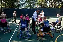 A horseshoe pit was created on the site of the present putting green by Harry Truman, and later re-established near the swimming pool by George H. W. Bush who was an avid player. Two month long horseshoe tournaments were held bi-annually during Bush's presidency, with teams consisting of maintenance and house staff and family members and administration personnel. Bush would frequently demonstrate his prowess at horseshoes for foreign dignitaries.[17][18]