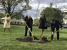 During French President Emmanuel Macron's 2018 state visit to the United States, President Donald Trump, First Lady Melania Trump, French President Macron and his wife Brigitte Macron planted a "European sessile oak from the Belleau Wood" on the South Lawn to commemorate the Battle of Belleau Wood.[23][24] The oak was originally sprouted at the World War I Battle of Belleau Wood grounds in northern France. The tree was removed to quarantine soon after planting.[25][26] The Department of Agriculture's Animal and Plant Health Inspection Service said at least two years of monitoring and testing may be required before the tree and the backup tree can be planted.[27]
