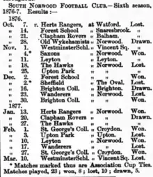 The Saxons match was an acrimonious one. The Saxons were said to be playing "on the win tie or wrangle principal", and were "apparently intent upon displaying their powers of polite repartee to make up for their deficiency in the knowledge of the Association rules." The approach did bring the Saxons the benefit of a goal which, according to the spectators, struck the tape and went over, but after the Saxons players "were prepared to take their affidavits that it went under", W.H. White, the South Norwood captain, conceded the goal. It availed the Saxons nothing as South Norwood were already four goals to the good.[9] Frank Haslam, the Saxons' captain, complained that South Norwood kept interrupting the game by claiming offside, and blaming White for "a temper and disposition which totally unfits him for the football field";[10] however the South Norwood secretary C.E. Leeds complained in turn about the Saxons players regularly disputing refereeing decisions, often in unison, and dismissed Saxons as "comparatively obscure".[11]