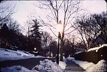 Gaslights on Vose Avenue near dusk