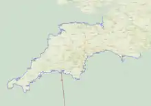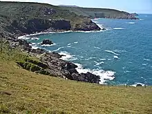 After passing The Lizard the path turns northwards, continuing past Housel Bay and a building used by Guglielmo Marconi for radio experiments,[51] then Bass Point with its Coastguard Station. The Lizard lifeboat station is a sheltered position in Kilcobben Cove. Passing through Cadgwith and across Kennack Sands, the path heads towards Black Head then into Coverack. Once around Lowland Point, The Manacles lie a mile offshore, a reef that has wrecked many ships.[52] The path passes through Porthoustock and Porthallow, then around Nare Point lies Gillan Creek. This can be crossed at very low tide, but most walkers follow the lanes round the head of the creek to reach Dennis Head at the mouth of the Helford River. To cross this wider river means following it inland to Helford where there is a ferry across to Helford Passage on the north bank. Some people take a short cut from Gillan Creek to Helford by a path through Manaccan.