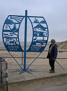 The South West Coast Path starts from the western side of Minehead, in Somerset, at a marker erected in 2001 and partly paid for by the South West Coast Path Association.[21] The path follows the waterfront past the harbour to Culver Cliff before climbing up on a zigzag path through woodland.[22] Entering the Exmoor National Park, it cuts inland past North Hill, Selworthy Beacon and Bossington Hill before regaining the cliff top at Hurlestone Point. After passing through Bossington it follows the beach to Porlock Weir and connects with the Coleridge Way.
