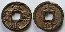 By the time of the Chongning Zhongbao (崇寧重寶) cash coins of the Emperor Huizong, 10 wén cash coins had become the norm as the government used it as a method to confiscate the wealth of the people to enrich its treasury.[3] In a story dating to the Northern Song dynasty time period, a man purchasing a bowl of soup is used to illustrate the hardship caused by the lack of 1 wén cash coins, which are known as Xiaoping cash coins (小平錢).[3]