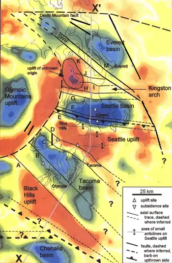 The Seattle Fault is a zone of complex thrust and reverse faults – between lines E and F on the map – up to 7 km wide and over 70 km long that delineates the north edge of the Seattle Uplift. It stands out in regard of its east–west orientation, depth to bedrock, and hazard to an urban population center.[107]