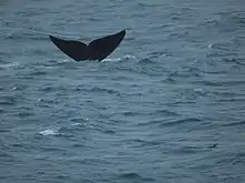 Like other right whales, they are rather active on the water surface and curious towards human vessels. Southern rights appear to be more active and tend to interact with humans more than the other two northern species. One behaviour unique to the southern right whale, known as tail sailing, is that of using their elevated flukes to catch the wind, remaining in the same position for a considerable amount of time. It appears to be a form of play and is most commonly seen off the coast of Argentina and South Africa.[13] Some other species such as humpback whales are also known to display. Right whales are often seen interacting with other cetaceans, especially humpback whales[23] and dolphins. There have been records of southern rights and humpbacks thought to be involved in mating activities off Mozambique,[24] and along Bahia, Brazil.[25]