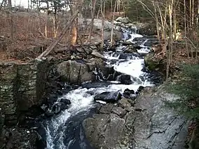 The fast flowing waters of Eight Mile Brook as it drops steeply from Lake Quassapaug to the Housatonic River provided power for an early industrial complex, which at one time included gristmills, sawmills, and the shops of iron workers, button makers, knife makers, clothiers and other skilled tradesmen.[4] Evidence in the channel suggests that man-made improvements were introduced to strengthen the river's flow.[5] At the turn of the 20th century, the Diamond Match Company bought up the site and built a factory for the manufacture of cardboard matchboxes. After the factory burned down for a second time, the site was ceded to the state in 1927.[4] The state park was established in 1932.[3]